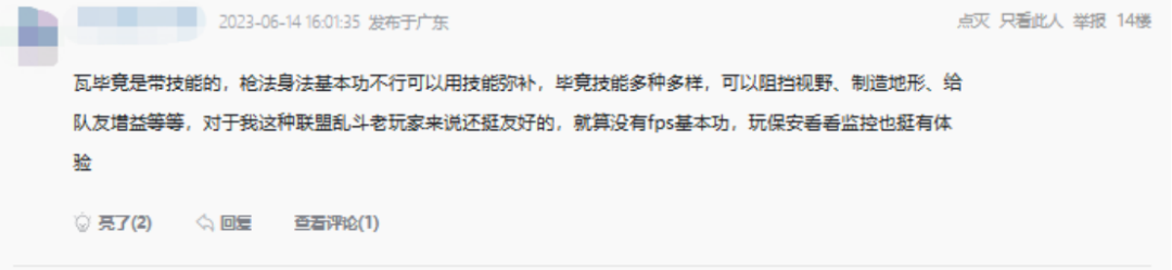 还有一些不是FPS游戏爱好者的人说,《无畏契约》颇具吸引力。他们在这里体验到了与众不同的竞技游戏,感受到了之前游戏里未曾有过的技能施放与射击的结合感,这让他们感觉拓宽了游戏的新境界。